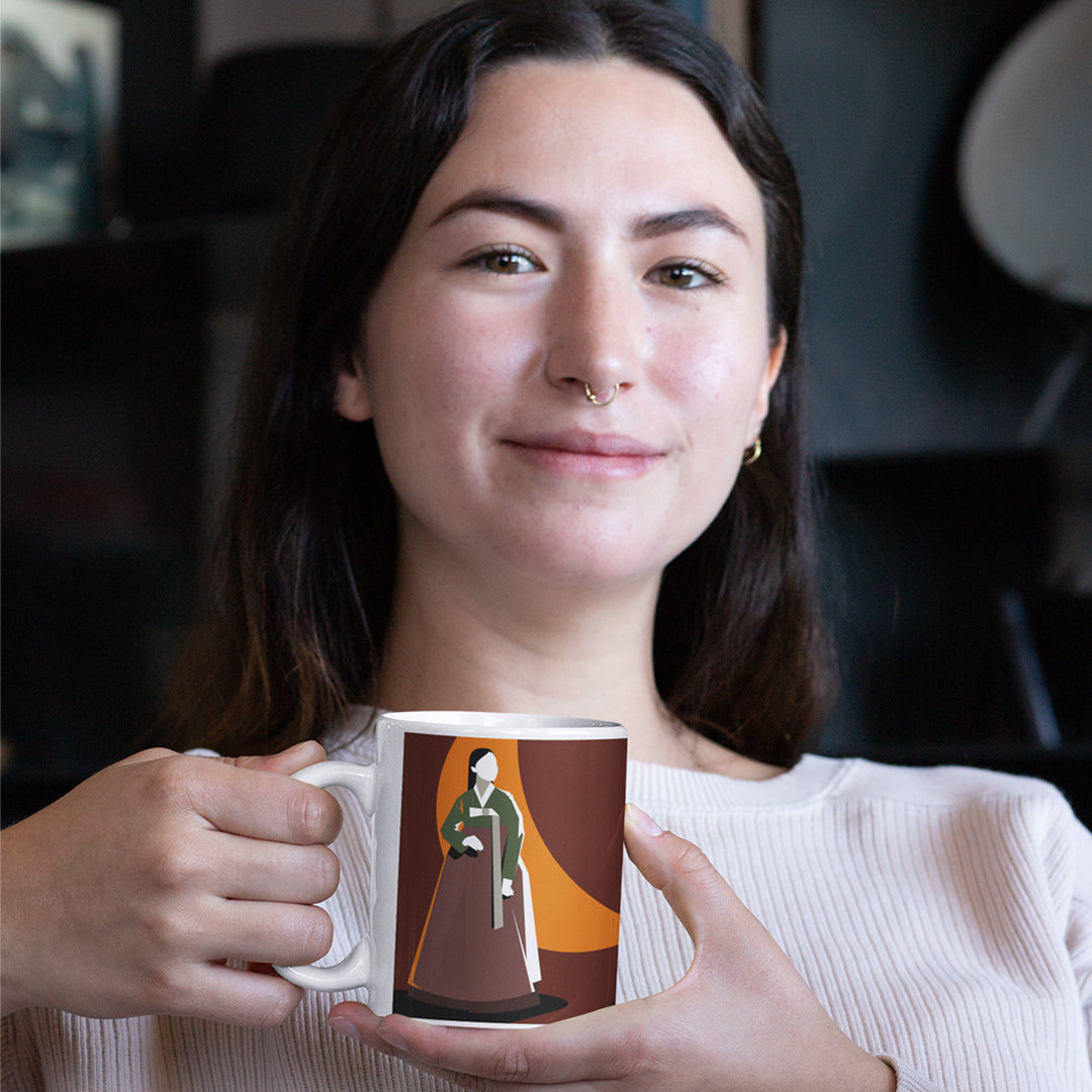 This lovely mug features an abstract image of a woman wearing a traditional Korean hanbok in front of a crescent moon. High definition print across both sides- perfect for either right or left handed users! Any Korean culture fan is sure to love this piece!