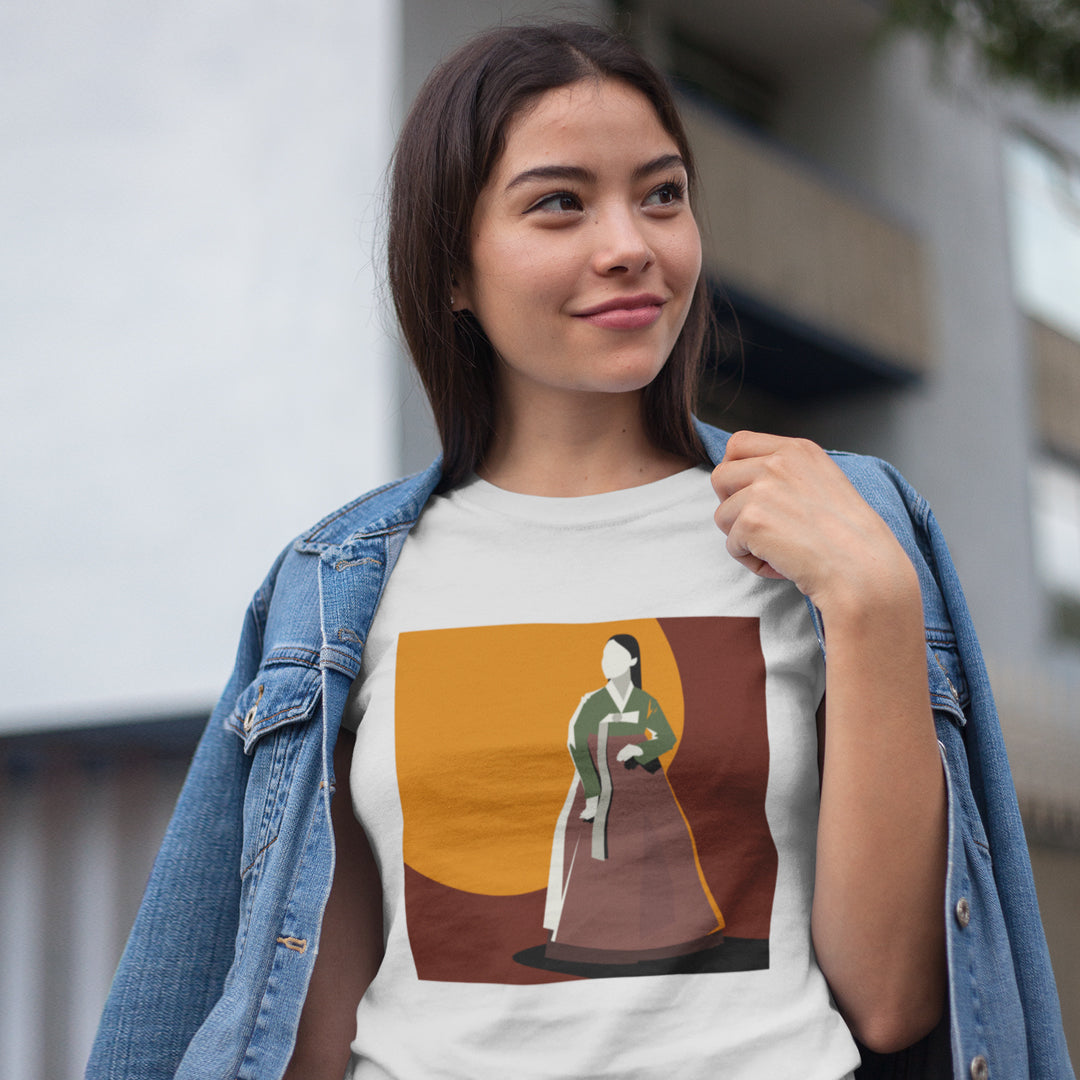 This lovely T-shirt features an abstract image of a woman wearing a traditional Korean hanbok in front of an orange sun. Any Korean culture fan is sure to love this piece!