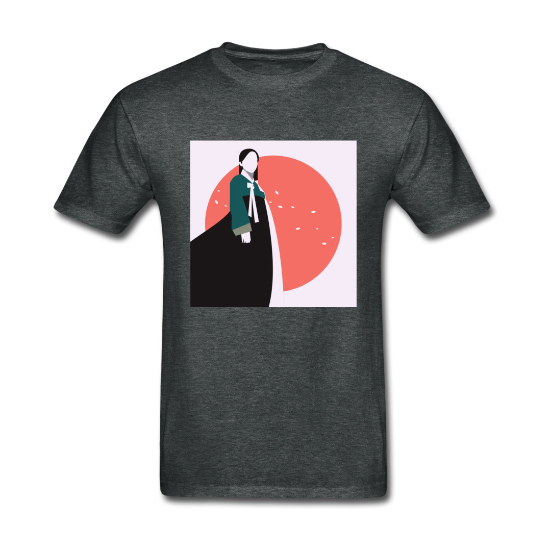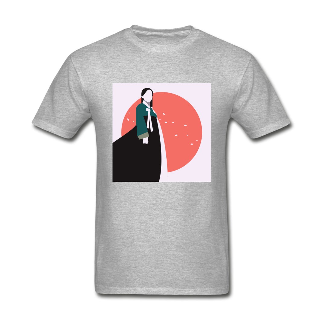 This lovely T-shirt features an abstract image of a woman wearing a traditional Korean hanbok with petals floating in front of a pink sun.Any Korean culture fan is sure to love this piece!